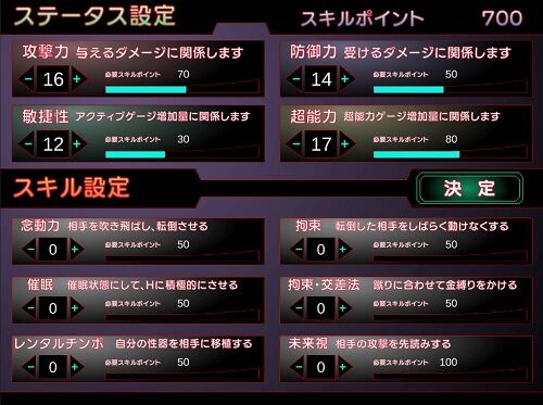 最初は絶対クリアできないから、とりあえず、ステータス上げとけばいいんだけど……。今作は、スキル少なめで、かなりスッキリ分かりやすい感じ。