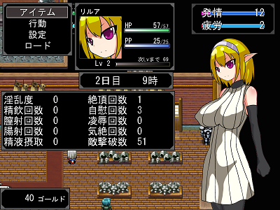 溜まり過ぎると攻撃力や防御力などのステータスに影響してくるので、定期的にオナニーしたりベッドで休んだりする必要がある。