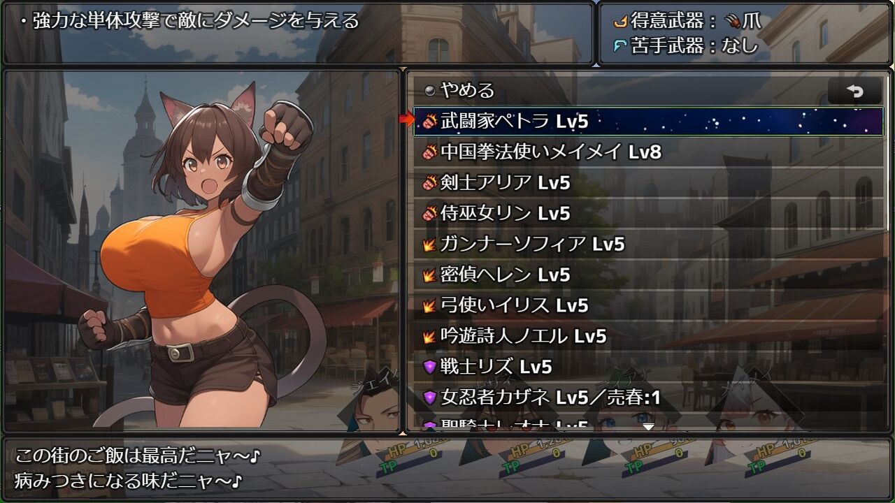 | 7 | ネア(盗賊) | 強 姦:強制騎乗位 | パーティーに加入していない状態で会話「襲う」を選択し、戦闘で勝利 |