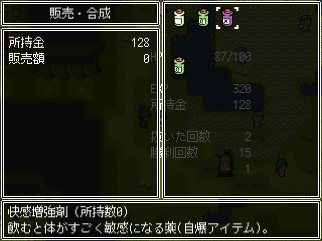 どうしても魔物娘に精根尽き果てるまで搾り取られたいって時は、魔少女のショップに快感増強剤なる自爆アイテムがあるから、敗北エッチをみたいときはそれを使うといいかもね。