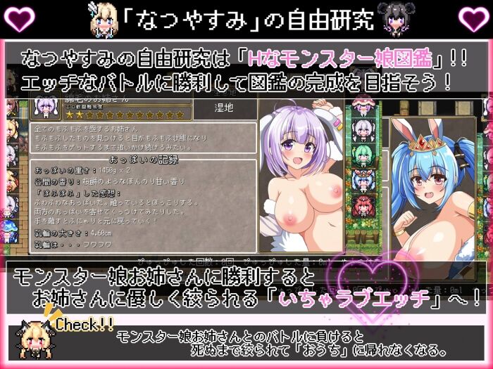 本作は単なるエロRPGにとどまらず、「なつやすみ」の冒険心をくすぐるゲームデザインや、愛らしいキャラクターたちとの触れ合いが存分に味わえる作品です。絵柄にピンと来た方、甘々なイチャラブやセックスバトルに興味がある方にはぜひプレイしてほしいタイトルです!