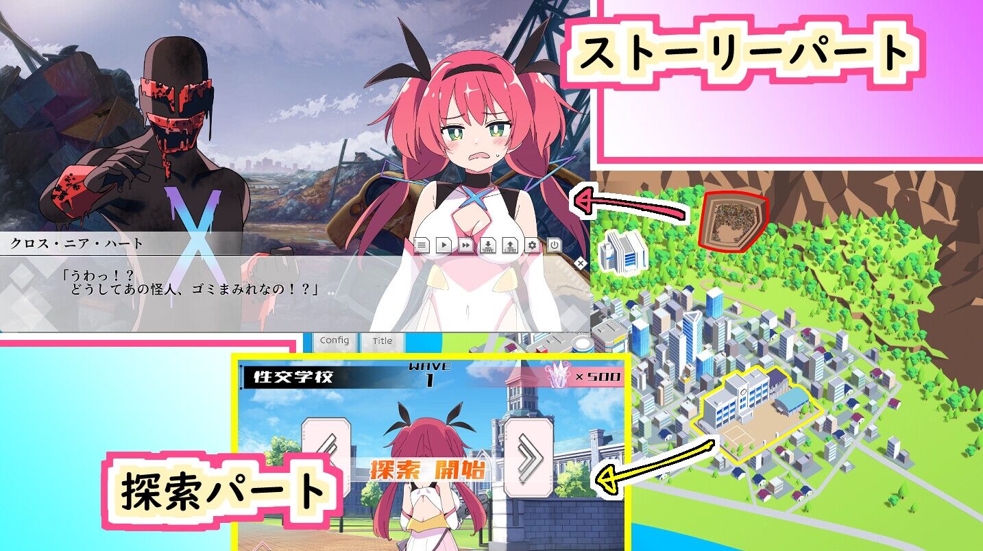 探索パートでは、装備を整えたり、敵の拠点を調査したりしながら、バトルに備えてクロスニアハートを強化していく。戦闘で手に入る「クロスバリュー」を利用し、スキル強化やカスタマイズを行えるシステムも搭載されている。