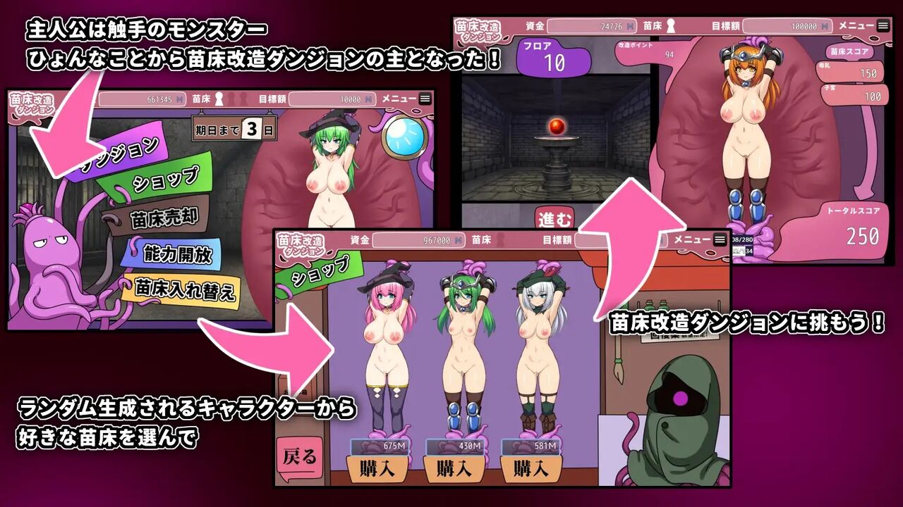 ランダム生成される美少女を自分好みに「肉体改造」できるローグライクSLGが登場!爆乳、ふたなり、触手責めなどマニアックな改造要素満載。苗床少女を育てて売りさばき、触手ダンジョンの主を目指そう!